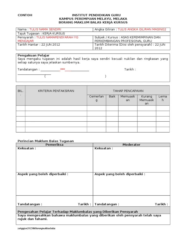 Related : Borang Maklum Balas Kursus : Tahap kefahaman kriteria dan masalah guru terhadap penilaian dan pentaksiran kerja kursus..