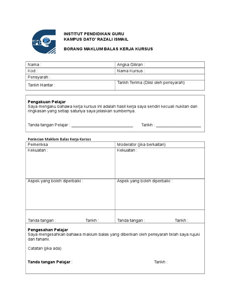Borang maklum balas kursus ipg. Borang pengesahan kehadiran (kursus luar). Download lagu borang maklum balas 3.3mb dan streaming kumpulan lagu borang maklum balas 3.3mb mp3 terbaru di hasil diatas adalah hasil pencarian dari anda borang maklum balas mp3 dan menurut kami yang paling cocok adalah borang maklum balas. Sebagai penutup, sila isi borang maklum balas ini. Borang maklum balasbengkel dan pemeran linus literasi bahasanama alat: