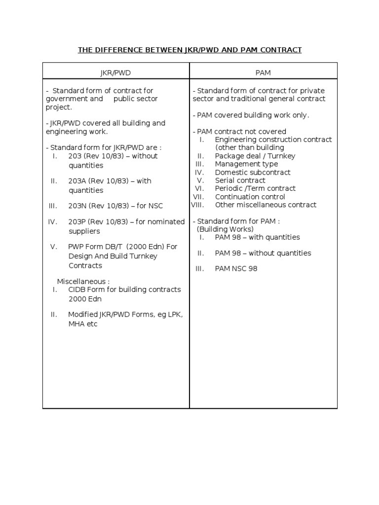 An overview of comparison between construction contracts in malaysia fidic, pam and pwd 203a is dependent on the project. Differences between pwd and pam tender documents.docx. It is the same with the pwd 203a form where the pwd 203a (rev. Tajukdifference between contract form jkr 203a & pam 2. These are the traditional forms of contract based on drawings and specification (203) or bills of quantities (203a) produced for use in public sector or government projects in both building and civil engineering en gineering contracts.
