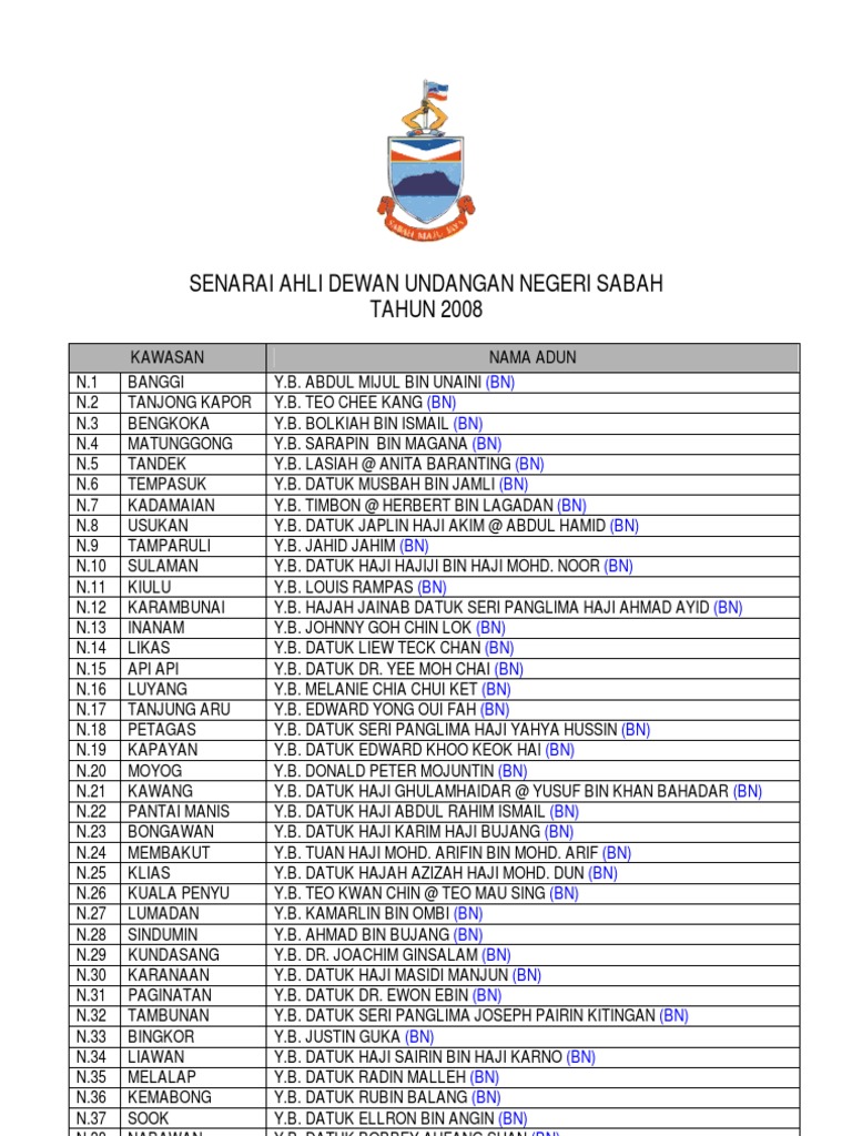 Savesave senarai ahli dewan undangan negeri sabah for later. Lamin koundangan pogun sabah) is a part of the legislature of sabah, malaysia. Dewan undangan negeri sabah eller sabah state legislative assembly (tysk: Perasmian pembukaan penggal pertama dewan undangan negeri sabah yang ke enam belas. Ketua menteri sabah, datuk seri mohd shafie apdal hari ini mengumumkan pembubaran dewan undangan negeri (dun) sabah.