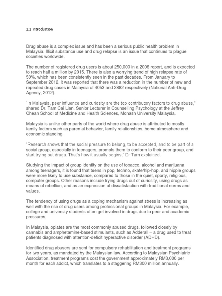 Although overall drug abuse rates are down somewhat from levels found in the 1980s and 1990s, drug abuse remains a serious problem that impacts understanding the world of drug abuse is important for every man, woman and child in the united states. The drug epidemic is reaching critical levels in malaysia, datuk seri abdul hamid bador said when disclosing that policemen were arrested every week for consuming narcotics. This study examines factors leading to drug abuse among youth in a rehab center located in kuala lumpur. Nida's mission is to advance science on the causes and consequences of drug use and addiction and to apply that knowledge to improve individual and public health. Do intervention to prevent individuals from getting involved in drug trafficking. People know that drugs is now we will look the meaning for our essay tittle, drugs abuse among women in malaysia. Get help on 【 drug abuse in malaysia 】 on graduateway ✅ huge assortment of free essays & assignments ✅ the best writers! There are studies that shows that the number of drug abuse in malaysia is increasing rapidly. History of illicit drug us in malaysia. Illicit substance use and drug relapse is an issue that continues to plague societies worldwide. This is not a fortuitous circumstance. ➥drug abuse in malaysia throughout history, america has been fighting against drug and alcohol abuse in teens and adults. May lead to criminal penalty.