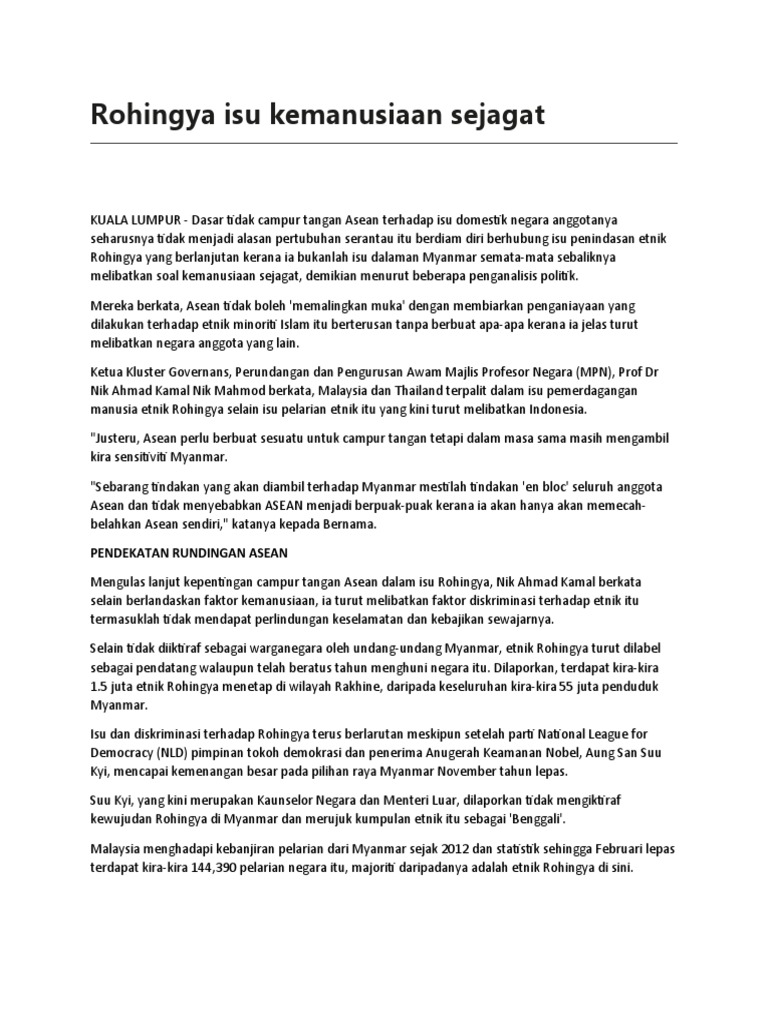 Lmck 1621 etika & profesionalpenindasan terhadap etnik rohingya nama pensyarah dr. Bakri mat, sebagai ketua penyelenggara urusan antarabangsa, universiti utara malaysia (uum) mengatakan bahawa terdapat banyak faktor dalam menyumbang kepada isu penindasan etnik rohingya itu sendiri. Namun dunia seakan buta dan tuli terhadap nasib meerka, tanpa ada penyelesaian konkrit. Antara negara yang menjadi persinggahan dan tempat berteduh bagi masyarakat rohingya termasuk malaysia. Etnik rohingya selama ni dianggap sebagai kumpulan minoriti paling ditindas di dunia. Ini antara maklumat yang kami dapat tentang siapa orang rohingya dan kenapa mereka ni dinafikan hak mereka. Konflik etnik di asia tenggara rashid. Orang rohingya menjadi pelarian adalah disebabkan faktor. Hal ini karena pada dasarnya wilayah rakhine yang di faktor politis seperti pada penyebab perang kamboja juga turut andil dalam melatar belakangi konflik rohingya yang terjadi. Konflik dan diskriminasi terhadap etnis rohingya di rakhine termasuk dalam ranah hak asasi manusia (ham). Kekerasan, pembunuhan, terhadap etnis rohingya seolah tak berujung. Penindasan ke atas etnik rohingya di wilayah rakhine, barat myanmar membuktikan keganasan bukan hanya dikaitkan dengan islam, sebaliknya mereka yang menggunakan agama untuk bertelingkah. Faktor hukumnya sendiri, dalam hal ini dibatasi pada ribuan pengungsi rohingya terancam tak punya tempat tinggal ramadhan ini.