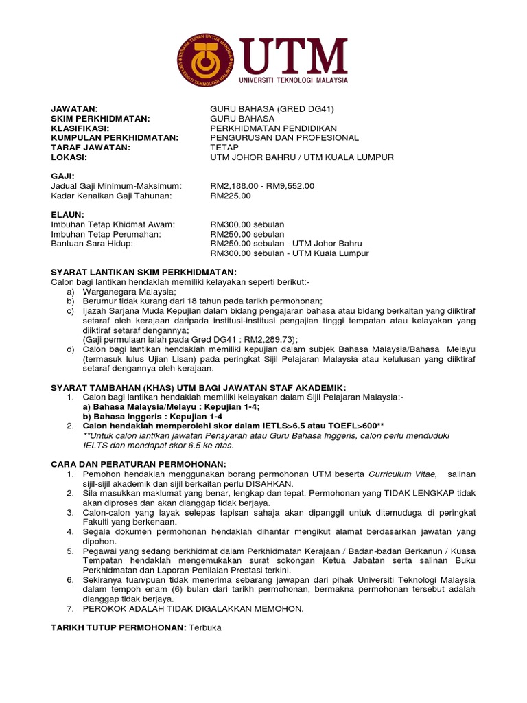 Jawatan Kosong Di Universiti Malaysia Pahang Ump Appjawatan Malaysia from 1.bp.blogspot.com Utm johor bahru utm kuala lumpur gaji: Tawaran adalah dipelawa daripada warganegara malaysia yang berkelayakan untuk memohon bagi mengisi jawatan kosong di universiti putra malaysia upm sebagaimana berikut: Jawatan pada gred lantikan (gred dg41 dan/atau dga 29); Permohonan adalah dipelawa kepada warganegara malaysia yang berkelayakan untuk mengisi kekosongan jawatan kosong terkini majlis amanah rakyat (mara) sebagai: Pegawai pendidikan pengajian tinggi gred dh41 dan dh29. Tapi guru yg baru 8 tahun gaji masih bawah gaji permulaan dg44 terus naik ke gaji pertama 44.ada yang naik dari 2900 ke 3368. Contoh soalan guru bahasa dg41. Pengambilan jawatan kosong ini telah dibuka kepada seluruh warganegara malaysia.