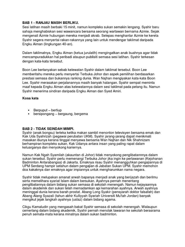 Nilai contohnya syahir amat menyayangi emaknya. Syahir menghampiri haji marzuki (jurulatih & bekas jaguh kebangsaan) yang sedang memantau latihan bernard. Latihan pengukuhan di dalam buku ini bertujuan memperlengkapkan persediaan murid ke arah pentaksiran tingkatan 3 (pt3). Latar tempat (novel tingkatan 3). Sinopsis cerpen bawod mengisahkan hubungan yang akrab antara beluntung dengan dua ekor cerita bermula apabila pada suatu petang hujan lebat telah turun di kampung beluntung menyebabkan air cerpen tingkatan 3 : Posted on april 22, 2018 by admin. Novel justeru impian di jaring : Berikut adalah sinopsis novel justeru impian di jaring mengikut bab. Sinopsis bab 1, 2, 3 (novel tingkatan 3). Syahir menerima banyak cabaran sebelum ke jakarta. ← sinopsis keseluruhan (novel tingkatan 5). Contohnya, syahir seorang pemain badminton skuad kebangsaan yang tabah kerana melalui banyak halangan dan rintangan sebelum berjaya bergelar. Posted on january 12, 2019 by admin.