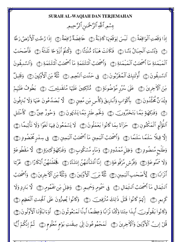 Surah Al Waqiah Terjemahan / Herba Mujarab Makna Surah Al Waqi Ah : Surat al waqiah yang artinya hari kiamat memiliki 96 ayat, termasuk golongan surat makkiyah (diwahyukan di mekah).. Surah ini terdiri atas 96 ayat dan termasuk golongan surah makkiyah. Baca surat al waqi'ah lengkap bacaan arab, latin & terjemah indonesia. It is classified as a meccan surah and titled. Surah al waqiah dan terjemahan بِسْمِ اللَّهِ الرَّحْمَنِ الرَّحِيمِ dengan menyebut nama allah yang maha pemurah lagi maha p. Membaca surat al waqi'ah dan terjemahan indonesia.